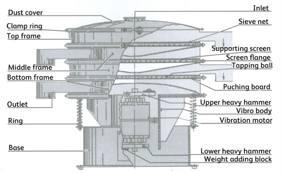 Its vertical motor, which is installed with eccentric hammers on the top and bottom, is regarded as a vibratory source. The eccentric hammers change the track of rotation into horizontal, vertical and inclined movement, and then pass the movement to the sieving surface. Adjusting the phase angle between the top and bottom eccentric weight can change trajectories of the materials on the sieve.