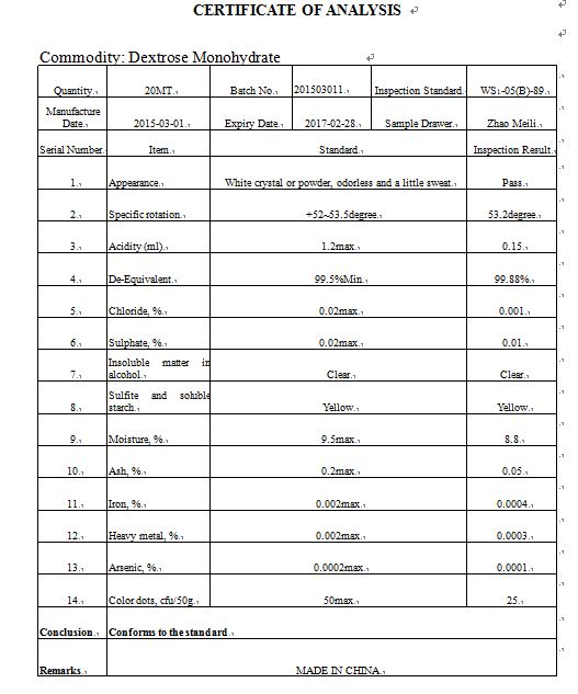 1.In industry Dextrose Monohydrate can be used as organic acid material and there are PH stabilization impregnant, adding-smell impregnant,resist-oxygen impregnant.It also can be used as organica impregnant material e.g. through the fermentation to making alcohol and carbinol etc.