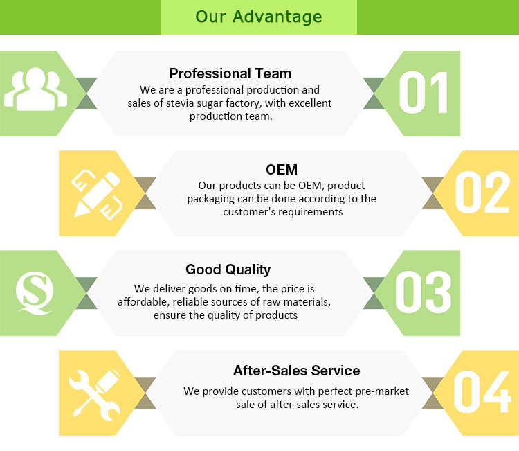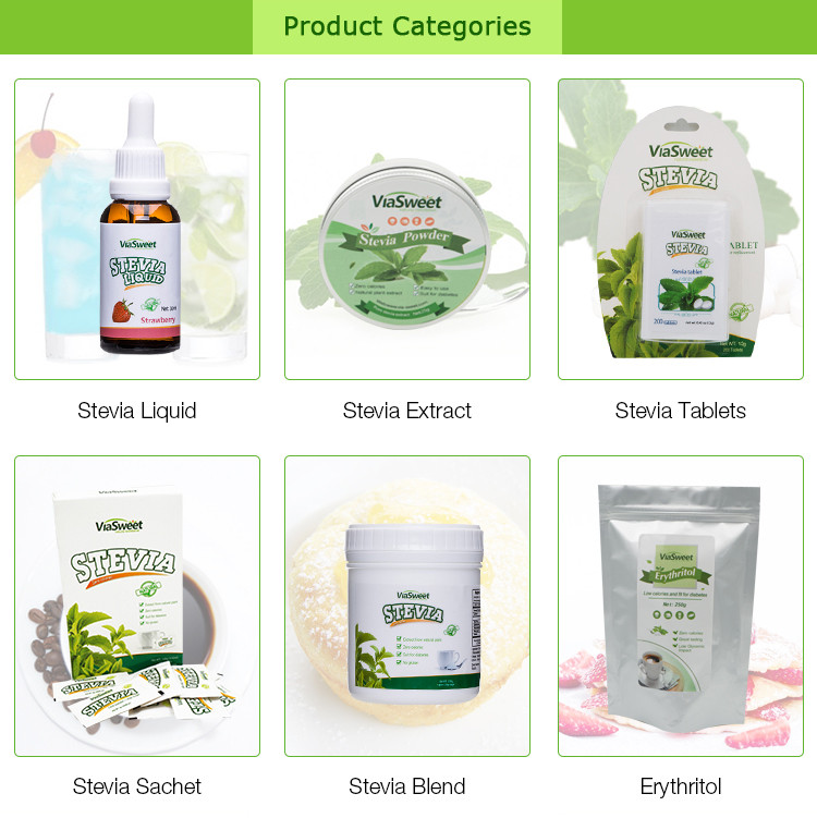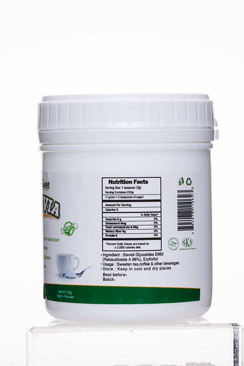 Ingredient | Stevia blend (powder form): 1.Stevia +Erythritol 2.Stevia+Maltodextrin Stevia blend (Granule form):Stevia Ra98%+Erythritol |