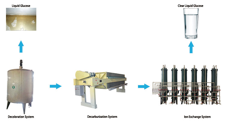 The glucose syrup pumping into the decoloration tanks, after twice decoloration to get pure glucose syrup, use the filter press to decarburizate, then Ion exchange system will attract all the cation and anion and other small electron, and get the very pure glucose syrup.