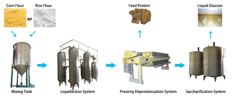 At mixting system, put water, corn, broken rice powder into the mixing tank, mixing uniformity then put in a starch enzyme, after the biological response use the pump to pumping into the liquefaction system, the corn powder at high temperature spray in regular time, the corn powder and rice powder will transfer to glucose slurry. The pressing deproteinization system use the filter press to make the protein stay inside the filter machine, get the purify glucose slurry,then put in glucoamylase, maintain at specific temperature, the glucose enzyme will transfer syrup into glucose syrup.