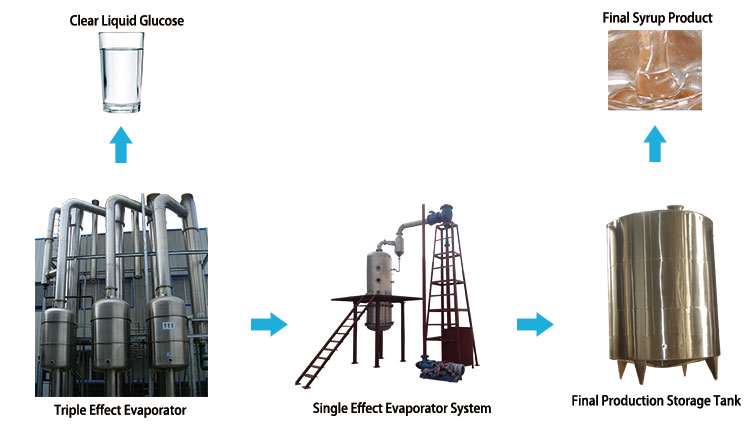 The pure glucose syrup have very low density, the triple effect evaporator and single effect evaporator can evaporate glucose inside water to outside increase density at very short time, and get the suitable density. The final production storage tank can maintain the glucose syrup purity, and easy to produce and transportation.