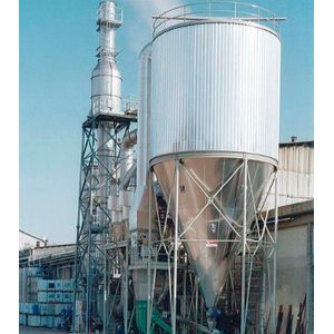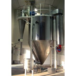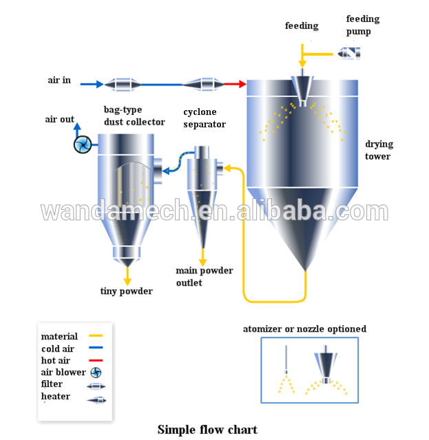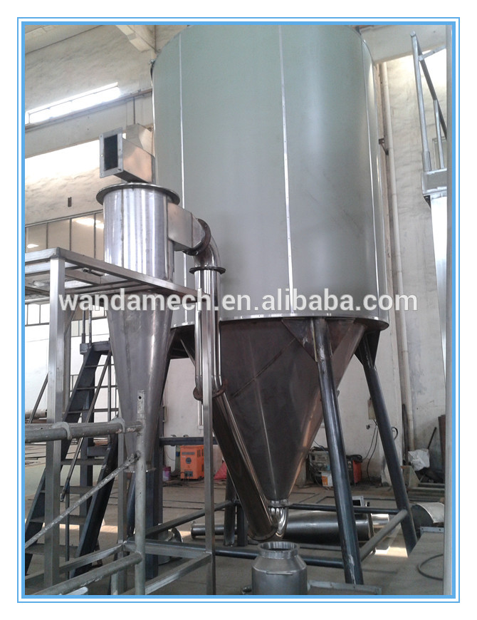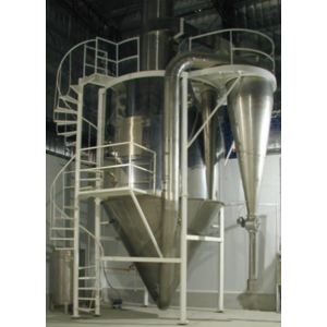 After filtering and heating, the air enters into air distributor on top of the Drying Equipment. The hot air enters into the drying tower spiral form and uniformly. By .passing through high-speed centrifugal atomizer on top of tower, the material liquid will rotate and be sprayed into the extremely fine mist liquid beads. Through the very short time of contacting with heating air, the material can be dried into final products. The final products will be discharged continuously from the bottom of drying tower and from cyclone separator