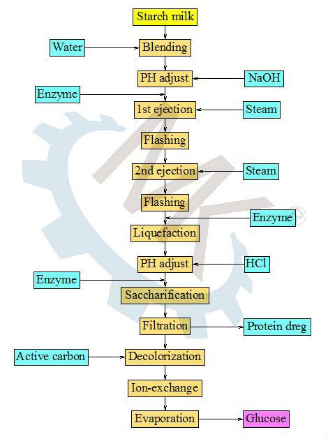 Glucose Syrup from StarchProject Capacity: Depends on customer's requirement. Process flow block diagram:Photos for main equipments:     Jet cooker Liquefaction column  Saccharification tank  Filter press  Ion exchanger Evaporator