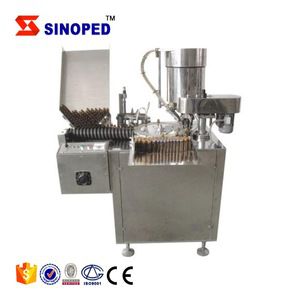It’s a major machine in production line for oral liquid, it main used in filling, capping placing and sealing of straight tube bottle. Tracking filling, cap automatically conveying by electromagnetic oscillator, three knifes centrifugal sealing (or screwing), no bottle no filling. Filling and sealing integrated in one machine, advanced design, compact structure and completely comply with requirement of GMP.