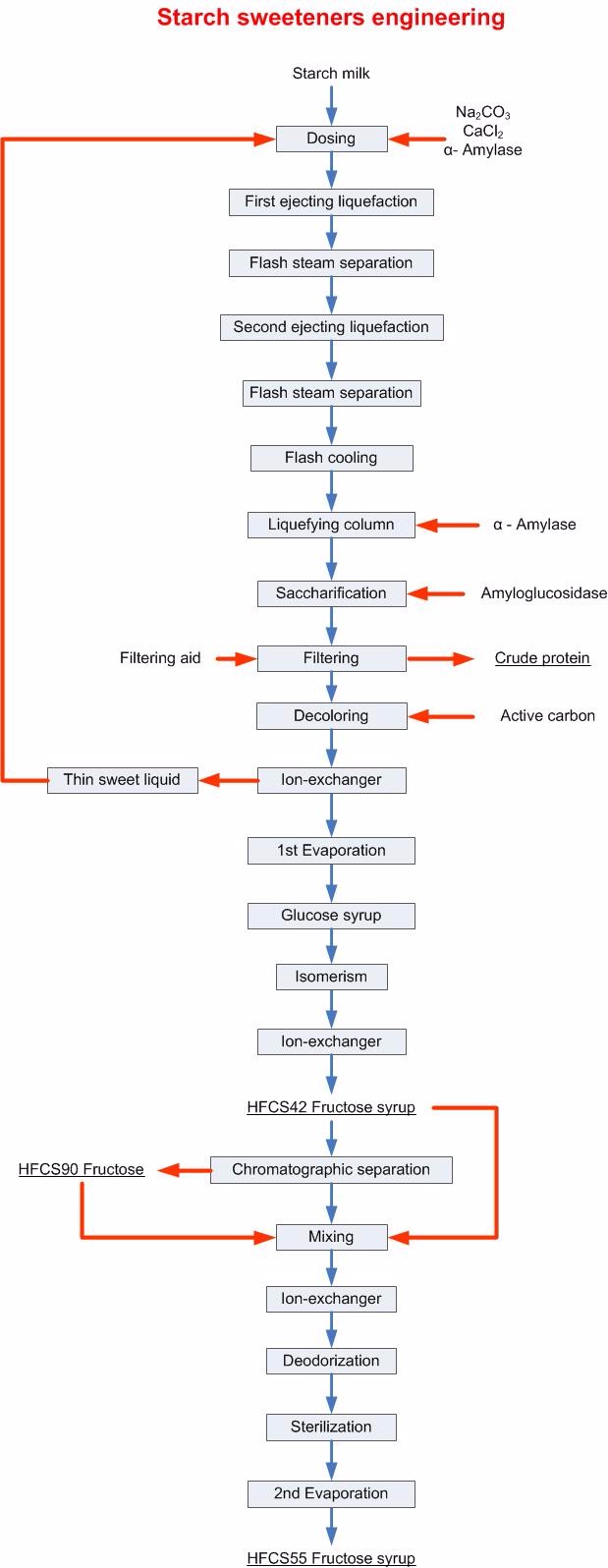 Starch sweeteners are made from starch by hydrolysis with acid or enzyme. The obtained liquid products including maltose, glucose syrup, fructose syrup; the solid products including monohydrate dextrose, anhydrous dextrose, crystal fructose, maltodextrin, etc.