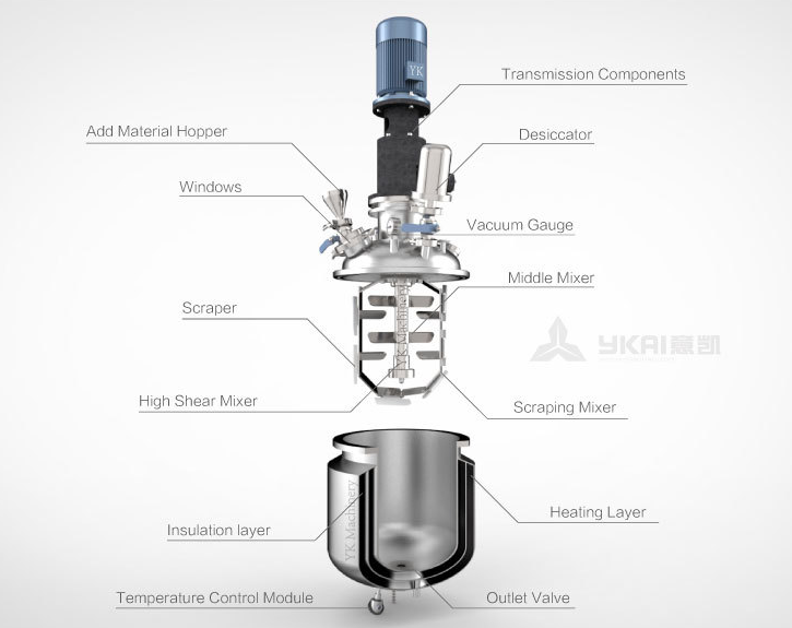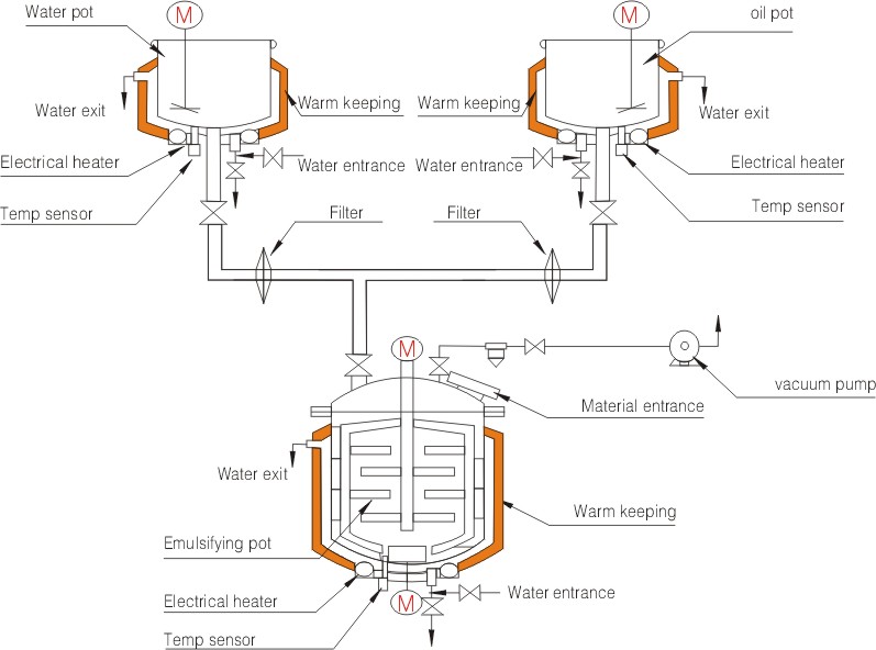 After the materials are heated & mixed in water pot and oil pot, they are drawn into emulsifying boiler by the vacuum pump. Adopting the middle stirrer & Teflon scrapers residues in emulsifying boiler that sweep the residues on the wall of the boiler makes the materials wiped off become the new interface constantly. Then they are cut off, compressed and fold by the blades to stir, mix and run to the homogenizer. By the strong cutting off, impact and turbulent current from the high-speed shear wheel and fixed cutting case, the materials are cut off in cut interstices and turn to particles of 200nm-2um promptly. Because the emulsifying boiler is under vacuum state, the bubble that produces in the course of mixing is taken away in time.