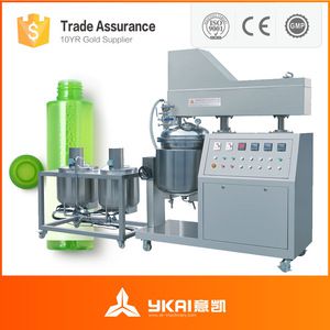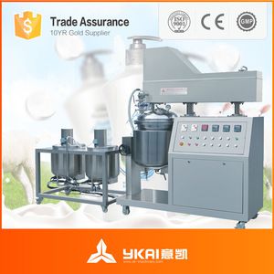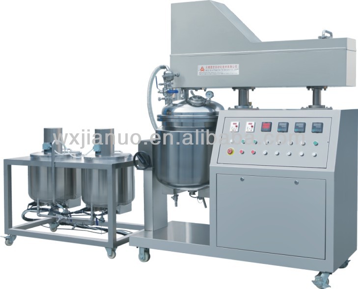 The pot cover is automatic rising type, the material is directly drawn into the emulsifying pot from oil pot and water pot based on a pipe that is under vacuum. The discharge is based on the turn the emulsifying pot. And the heating system is electric heating or steam heating that the temperature is automation controled. Put the cooling water into the jacket to cool the material, which is simply operated and safe. There is a heat preservation layer outside the jacket. The homogenizer and the blade stirring can work together or separately. The material will be sliming, emulsifying, mixing, dispersing, etc. in a short time. The parts Contact the product adopt high-quality stainless steel (medical usage adopt SS 316L. the interior surface is mirror polished, vacuum mixing device is hygiene. It's produced accroding to normal htgiene of GMP standard. It is the most ideal production equipment for cream and lotion.)