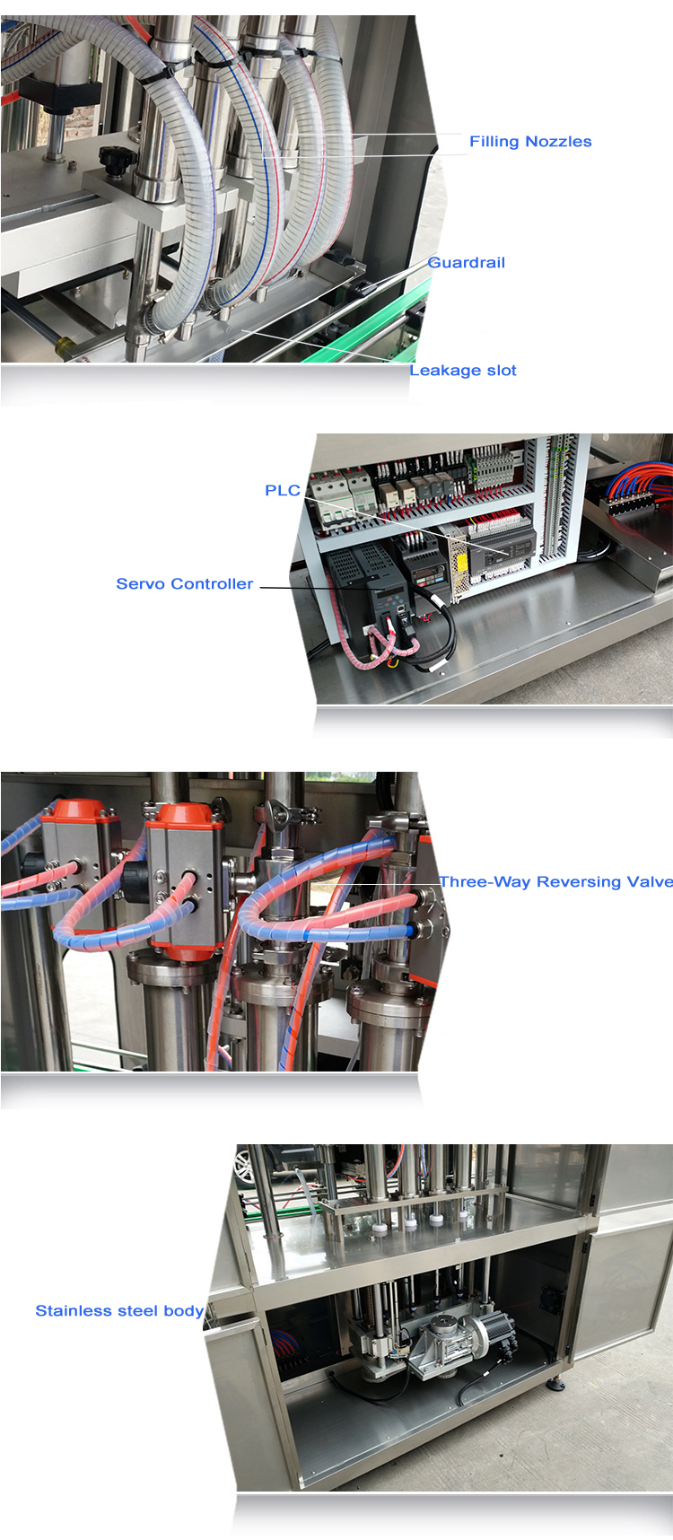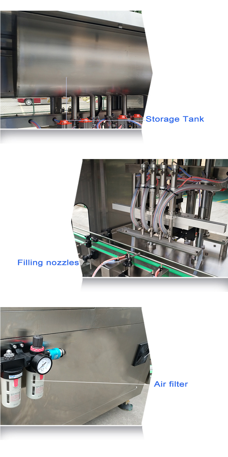 Function | This automatic filling machine, adopts plunger pump filling, Equiped with PLC and touch screen, easy to operate. Main pneumatic parts and the electronics are famous brand from Japan or German. The body and the parts contacting with product is stainless steel, clean and sanitary comply with GMP standard. The filling volume and speed can be adjusted easily, and filling nozzles could be changed according to actual needs. This filling line can be used to fill various liquid products of medicines, foods, drinks, chemicals, detergents, pesticide, etc. e.x. shampoo, detergent, lotion, juice, wine, vinegar, etc. |