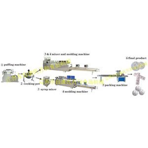 Puffing machine→Sugar cooking machine→mixing machine→forming&cooling conveyor →packing machine