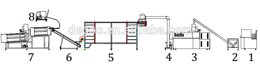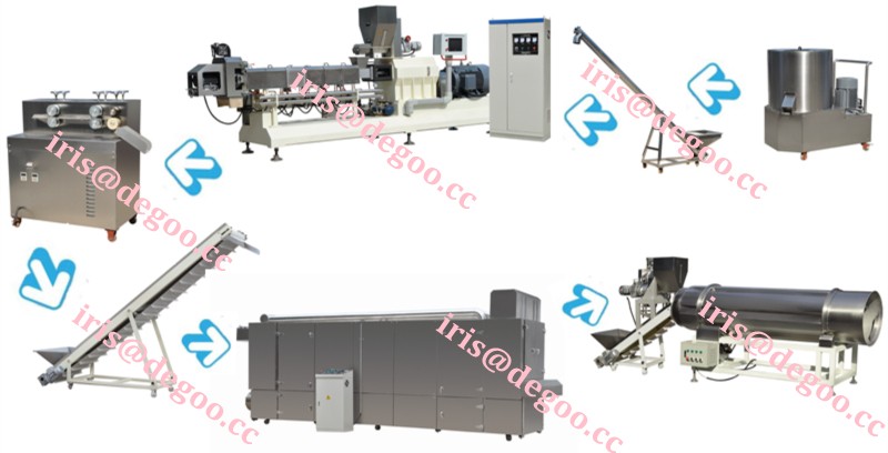 Its processing flow is:Mixer---Conveyor---Double screw extruder---Drying oven---Flavoring machine---Oil spraying machine