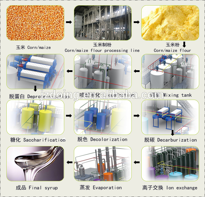 The old technolgy of corn glucose syrup processing plant is using the corn starch as material, the newest technology of syrup manufacturing process plant can use the corn as raw material, no need convert starch firstly, then been corn syrup, can be took of sryup from corns or maize.
