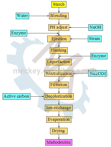 (3) Filtration and decoloring: Maltodextrin is cleaned by removing the protein and other foreign items with filter. Active carbon is needed for decoloring at proper temperature. After decoloring, the AC will be removed by filter. And then the material will be sent to the next section.