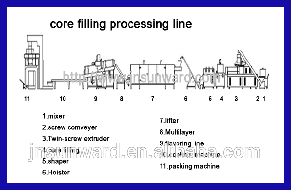 Raw materials mixing----------Conveying----------Extrusion---------Core Filling---------Shaping and Cutting--------Hoisting---------Drying-----------Flavoring.