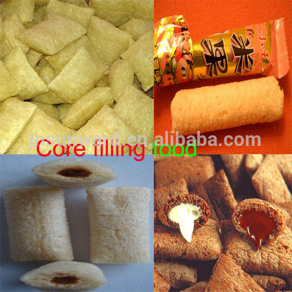 Core filling snack food can take chocolate, cheese and cream as stuffing materials,which can be mixed with yoik, milk powder and gingili sauce.We can feed the stuffing into extrusion food just before it is extruded from extruder by cre filler.this kind of core-filling food tastes crispy and delicious,such as core-filling pillow, tube and wafer.Core filling snacks food machine can use corn, rice and other grain as main materials.