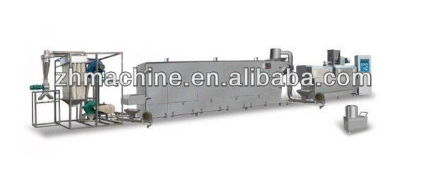 Baby food machinery is used to produce infant baby food and some other instant flour products. The raw material is put in the mixer then mixed ingredients are fed into extruder feeder. The extruder is fitted with: special cylindrical holding silo; vibratory doser with hopper to feed the extruding screw; extrusion mechanism and cutting; independent electric panel.After the extrusion the product is conveyed till the continuous rotary drier through a pneumatic conveyor. The continuous rotary drier has a heat exchanger with gas burner that allows a better heating of the product and it is economically viable owing the low cost of electric power. Case the client prefers we have the electric drier also.