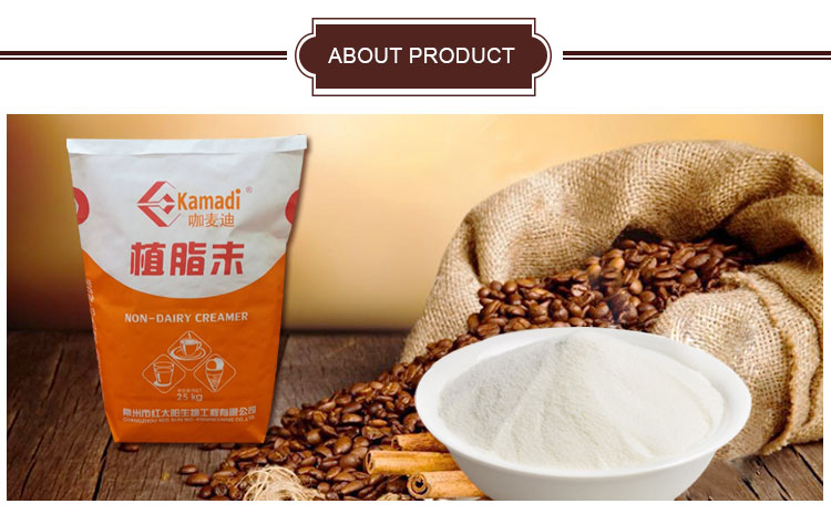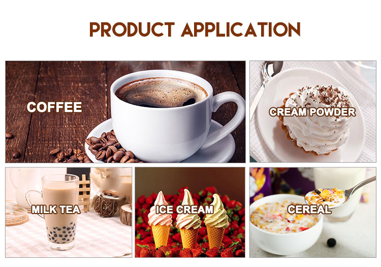 Non-dairy creamer , also called cream, coffee mate, is made from grape syrup, plant oil and powder materials such as mixture, the spray drying to have good liquidity and thermal stability of milky white or part that powder.The product has a strong natural milk flavor, which is mainly applicable to solid drinks such as candy, milk tea beverage and grain beverage, which can enhance the taste, improve color, and enhance the milk flavor.