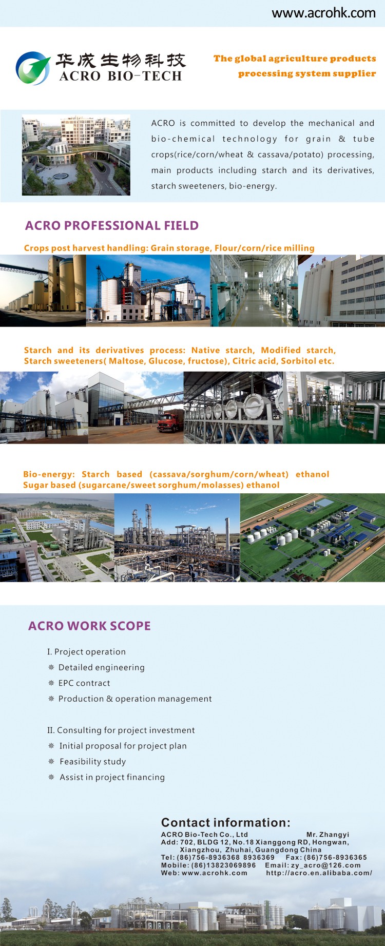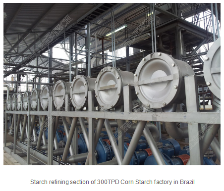 ACRO Design features of the processing line will be typical "wet milling" and "closed cycle process flow", with process principle of material flow, water and heat circulation; counter current process adopted for corn steeping, germ washing, fiber washing and starch washing system; fresh water introduced to starch washing only, process water will be reused as wash water for germ and fiber, steep water preparation etc.; in this way, water consumption and waste water volume reduced, meanwhile, high quality and yield of products can be achieved.