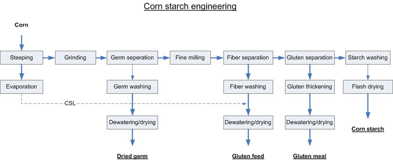 The purpose of corn wet milling is to separate corn into four main components - starch, germ, fiber, protein (gluten) and corn steep liquor (CSL); and then convert the components into useful products.