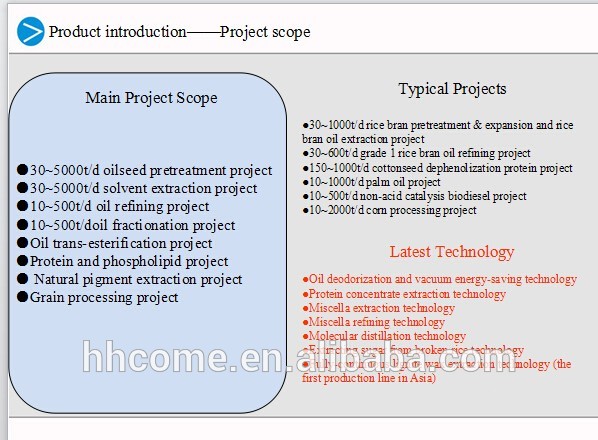 Huatai machinery has developed projects including large scale oilseed pretreatment and pressing, oil extraction, oil refining and oil fractionation production line project,conveyor equipment project,corn/maize flour, grits, germ milling machines and corn processing lines,biodiesel technology,cottonseed, rice bran and soybean protein technology, and Palm Oil processing lines,etc.