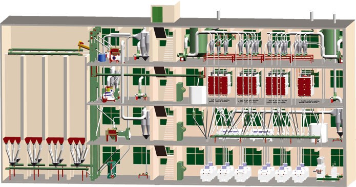 To clean out the middle and small impurity from wheat. e.g., dust, stone, magnetic material, wheat was bitten by insect and so on.Includes beating, screening, destoner, magnetic separator and dampening.this section is make the wheat to prepare for millling part and to protect the machinery as well.