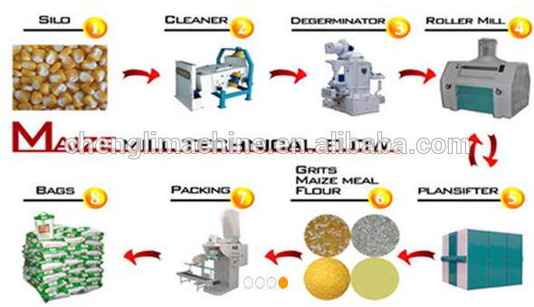 Raw material corn Maize- bucket elevator-separator-magnetic box-low pressure air blower-destoner- bucket elevator-air aspirator –emery roller dehuller-tank- emery roller dehuller-iron roller polisher- bucket elevator-grading sieve-germ separation table-hammer mill-grits polisher- bucket elevator-flour sifter-husk separator-plan sifter- low pressure air blower- air aspirator- Grits packaging.