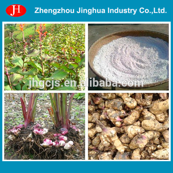 Canna edulis Ker - hydraulic transport - cleaning and conveying - second cleaning - peeling -rasper or grinder - slurry washing - de-sanding - refining and concentration - vacuum dehydration - airflow drying - packaging - storage