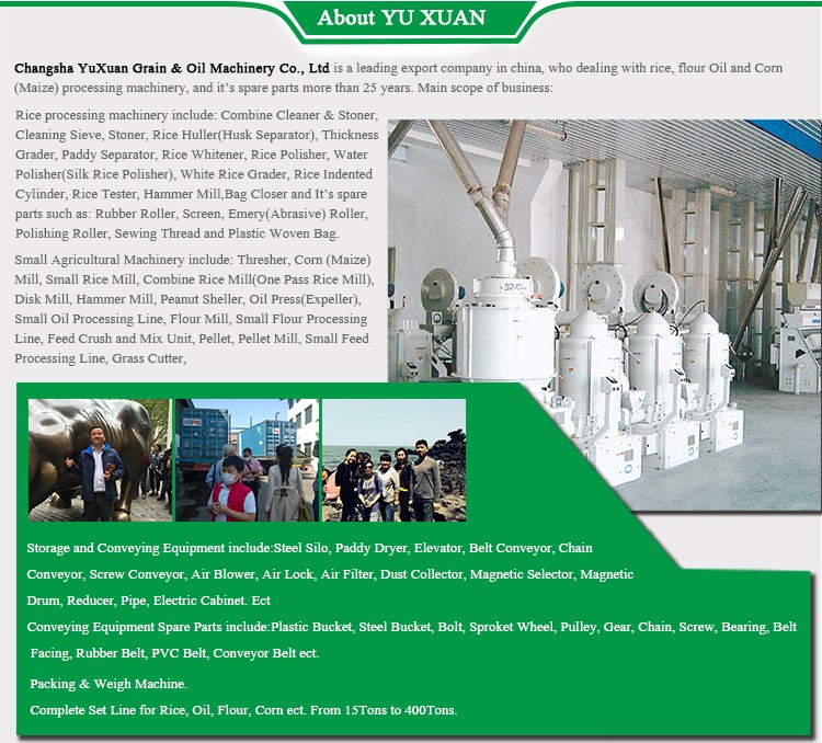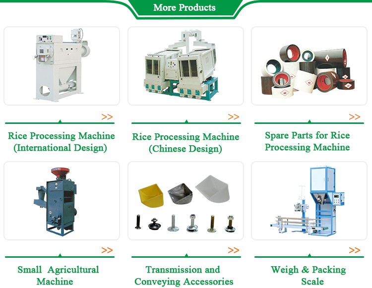 | Characteristics: 01 Good appearance and durable, with adopting international standard, imported parts, advanced manufacturing technology. 02 Wear parts have met international standards, durable and less service. 03 Equipped with current and negative pressure indicator and multi position air gate adjustment as well, convenient to use and reliable. 04 Adopt the construction of under-side feed and top discharge; With less broken rice increment, easy bran discharge, less bran content in rice.05 Use rice knife adjustment, rice knife assuming the form of three positions and 120° one another; can be adjustable in the processing; with high rice degree, less broken rice increment. |