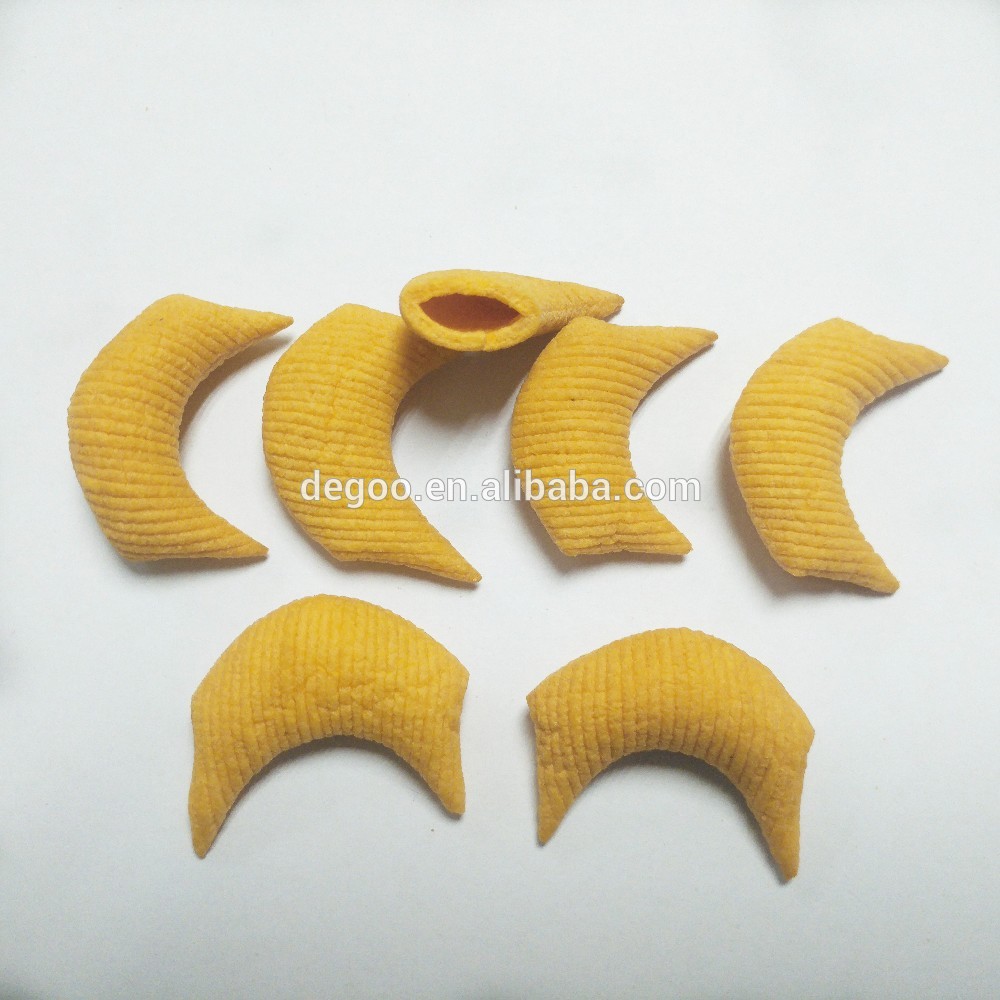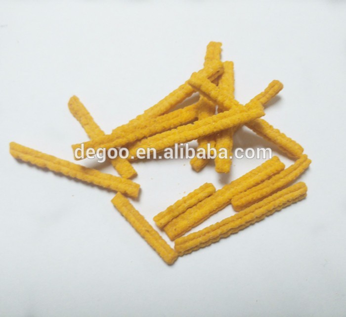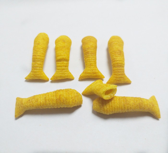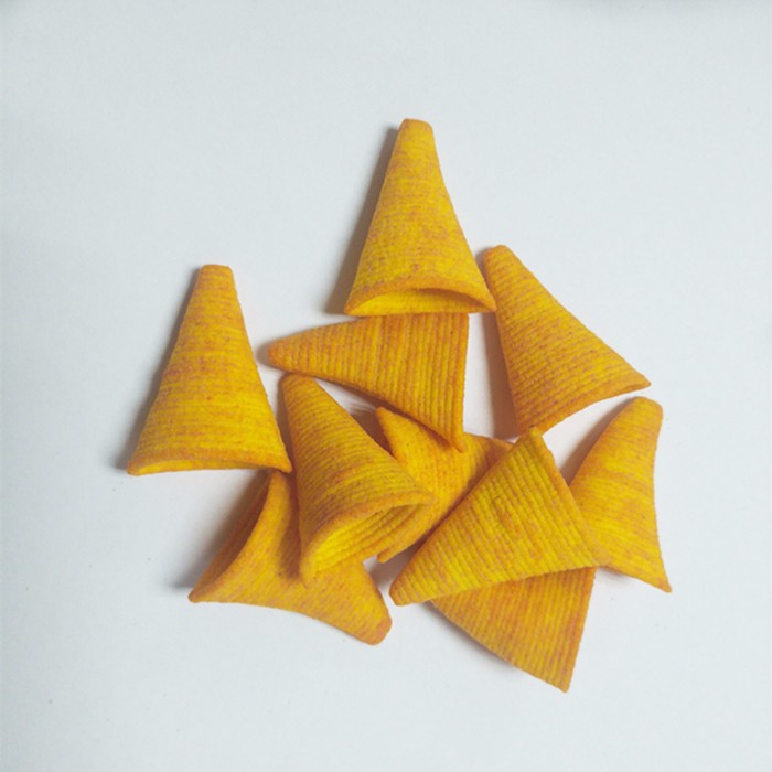 Fried Wheat Flour Corn Cone Extruded Snacks Manufacturers Produce Process Plant uses double screw extruding technique to replace the traditional steam boiling process. It includes mixing, cooking, extruding, and shaping process, no needing boiler, with simple process, high efficiency and little pollution. The raw materials can be rice powder, corn powder, wheat flour individually or their mixture. Only by changing the moulds, shaping or cutting machine, the shapes can be various: sticks, square sheet rib chips, diamond chips, wavy chips, pillow shapes and bugles etc. The taste is good and no greasiness.