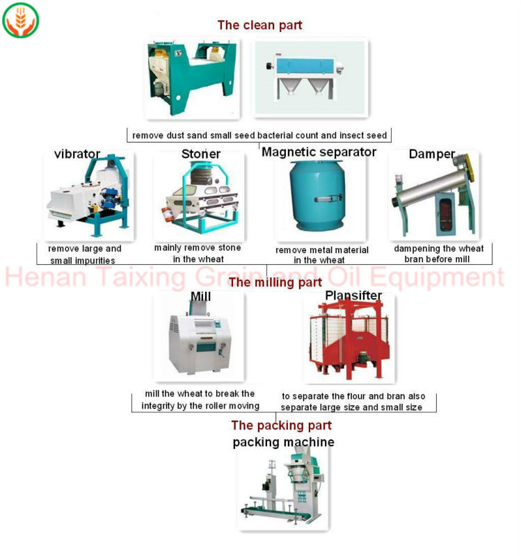 Main machines: roller mill, double section plansifter, conveyor, bran brusher etc