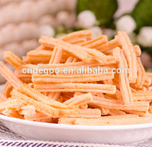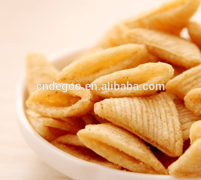 Snacks food machine adopts corn, rice, wheat, oat, barley etc as ingredients to make puffs snack. Through friction of screw and barrel, the grains are cooked in the extruder Barrel. Forming is at the die face cutter. The product shape is determined by a combination of the die aperture, including ball, tube, stick, ring, fruit loop, star, wheel and flower etc.