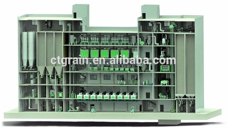 Our 500tpd wheat flour processing plant equipment has a production capacity of 200-500 tons/day. These machines are mainly installed in reinforced concrete buildings or steel structural plants, which are generally 5-to 6-storey high (including the wheat silo, flour storage house, and flour blending house).