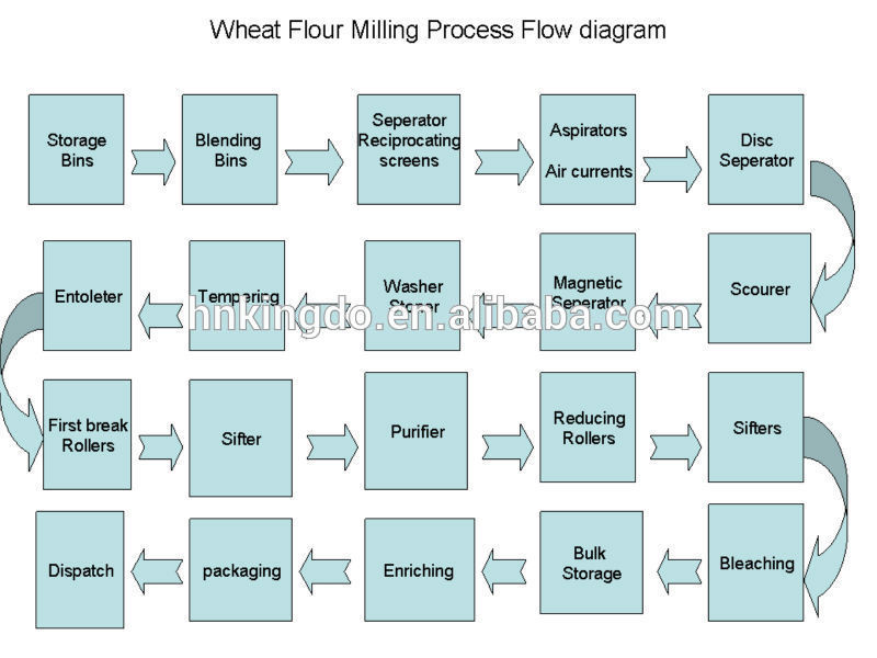The part of tempering wheat adopts two adding water with different level, which can make the water be infiltrated into the center of the wheat to make the bran soft and separate the endosperm from the bran easily; and make broken bran less, and improve the extraction flour, at the same time it can improve the color of the flour and lower the ash content.