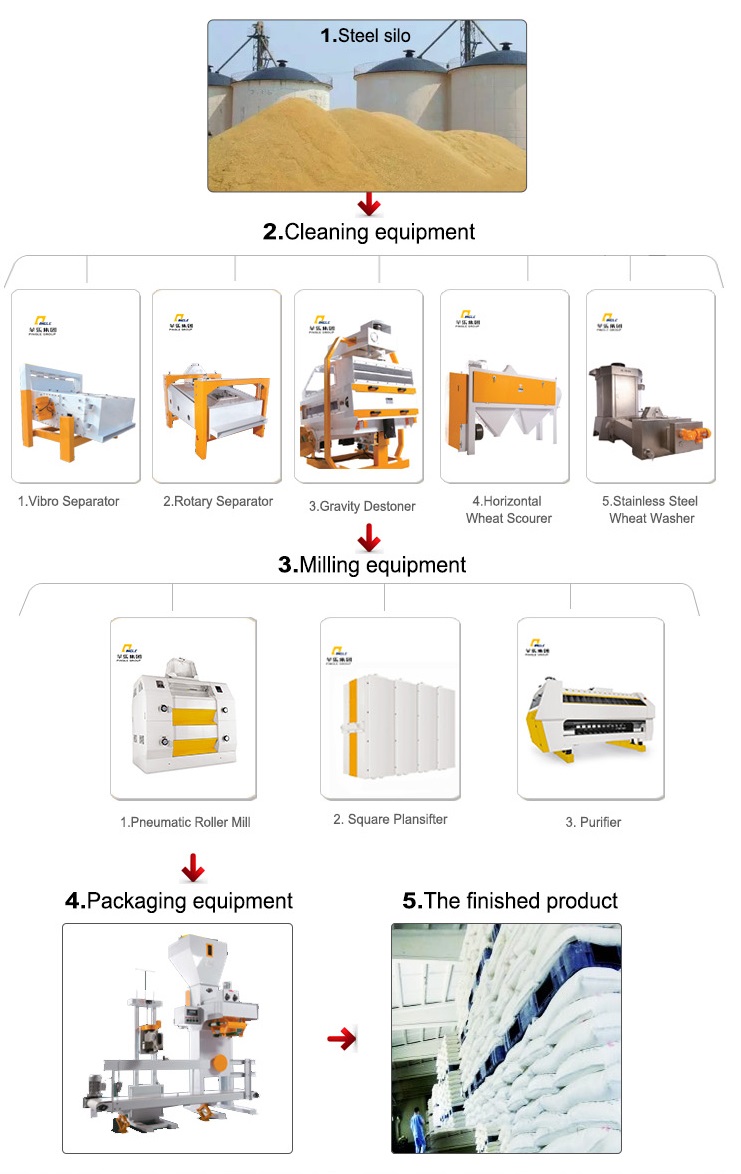 | Type | Final Products | Power Requirement(KW) | Power Consumption /Per Ton(KW/h) | Capacity (Per ton of wheat/24h) | Workshop Dimension |