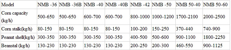 Productivity for sieve pore diameter 2mm: Corn: 500-650KG Corn stalk: 100-200KG Peanut shell: 400-500KG Bean stalk: 150-250KG Different grain and crops has different productivity Other type machines (different output) are available. |