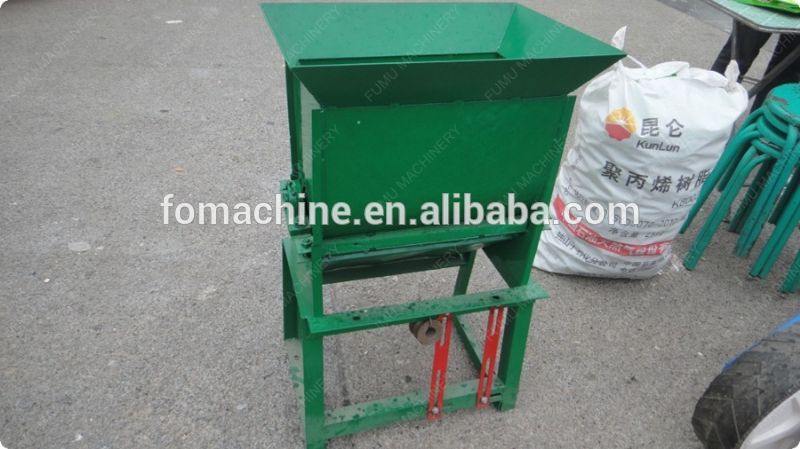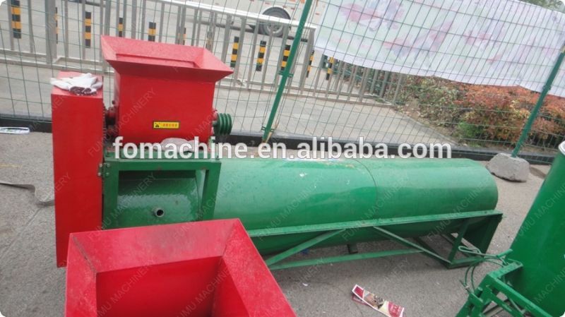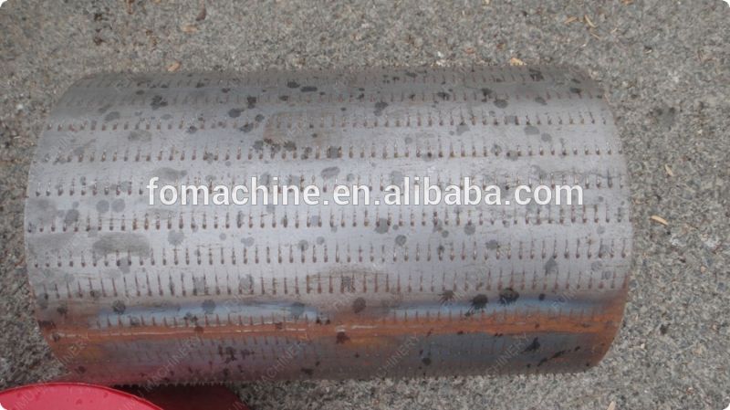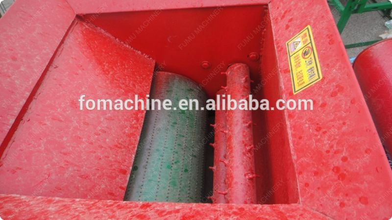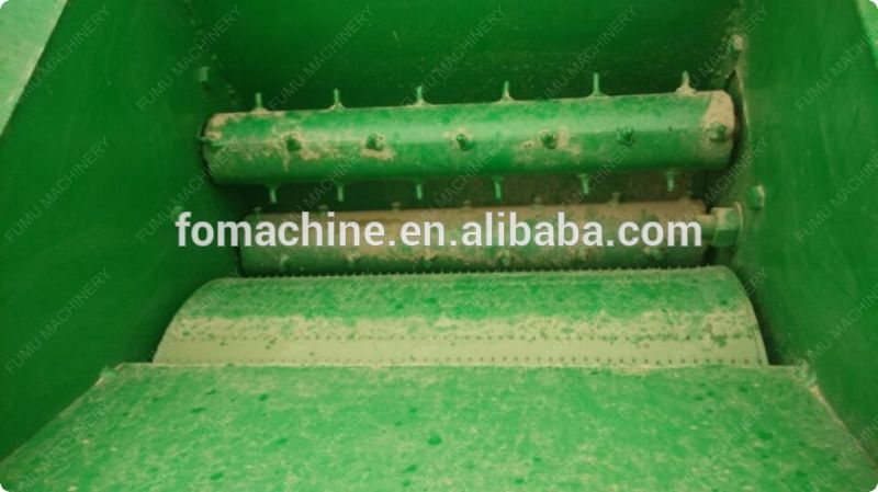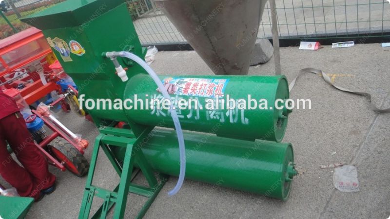 Potato crushing and starch extracting machine feeding part is composed of roller with shape rack,when feeding, raw materails is crushed into very small pieces to drop to below chamber which is with inside brush and outer screen.The screen hole diameter is very fine, only starch with water could though it out from the screen,big scum come out from the end of the machine.