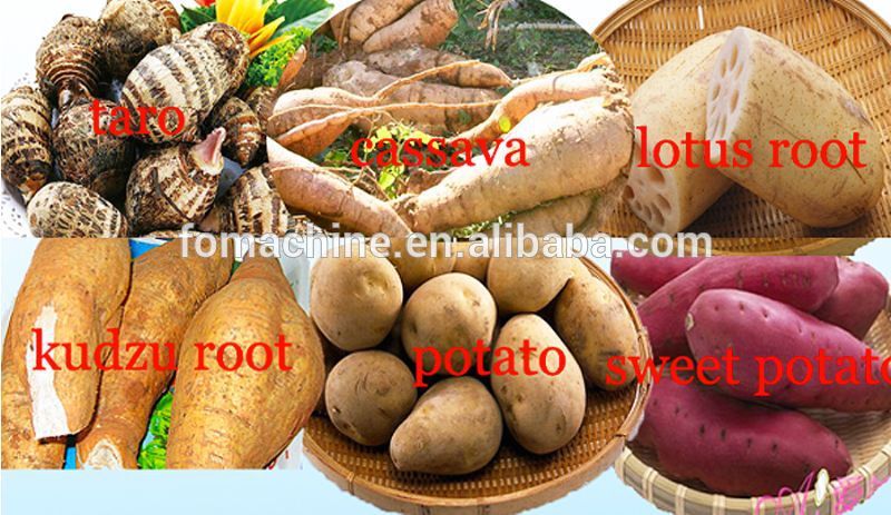 The machine can be used to all kinds of root tubers, like cassava, kudzu root, potato, rato, lotus root, arrowroot, sweet potato, etc.