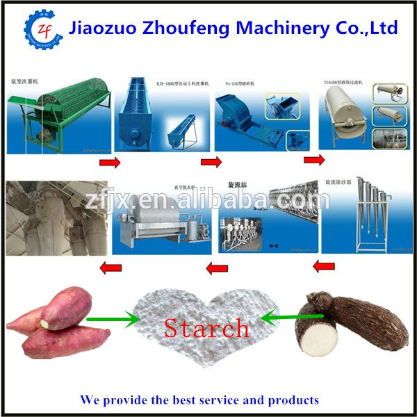 Cassava starch processing equipments can process fresh cassava, sweet potato and potato into refined starch. This production line includes 9sets equipments and they are: Squirrel-cage potato washer, automatic feeding and washing machine, crusher, separator, sand remover, mixer, screw conveyor, hydrocyclones, dewater and airflow dryer.