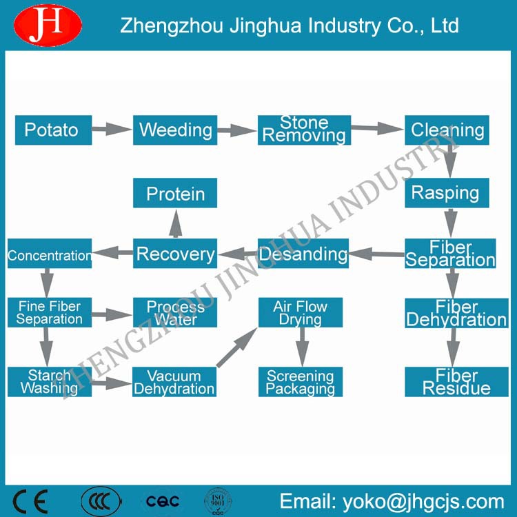 The whole potato starch production line machines includes: Feeding Machine; Washing Machine; Grinder; Starch extraction Machine; Desander; Starch refine system; Drying Machine; Packaging Machine for Flour.