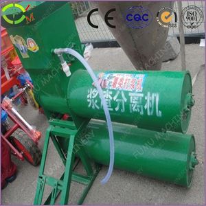 Potato crushing and starch extracting machine feeding part is composed of roller with shape rack,when feeding, raw materails is crushed into very small pieces to drop to below chamber which is with inside brush and outer screen.The screen hole diameter is very fine, only starch with water could though it out from the screen,big scum come out from the end of the machine.