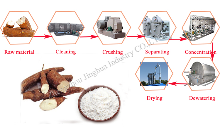 The whole tapioca starch production equipment is comprised of four major sections: Washing & Crushing Sections, Screening Sections, Concentrating Sections and Drying Sections.