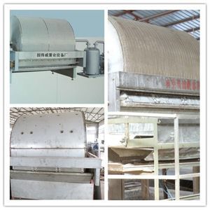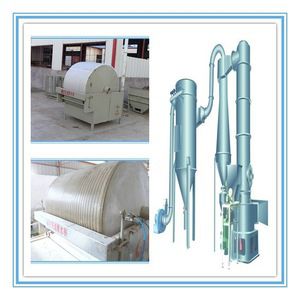 The starch out of the cyclone station has big moisture so it must be de-watered then dried. The starch slurry enters vacuum de-watering filter tank from the starch milk buffer tank. Under the vacuum formed by the vacuum pump, the starch slurry is sucked to the drum surface, then filtrate goes through filter mesh and enters the filtrate separating tank. The starch cake remains on mesh surface and is scraped off by a scraper and transported by the conveyor belt into the air dryer. Then weighing and packing.
