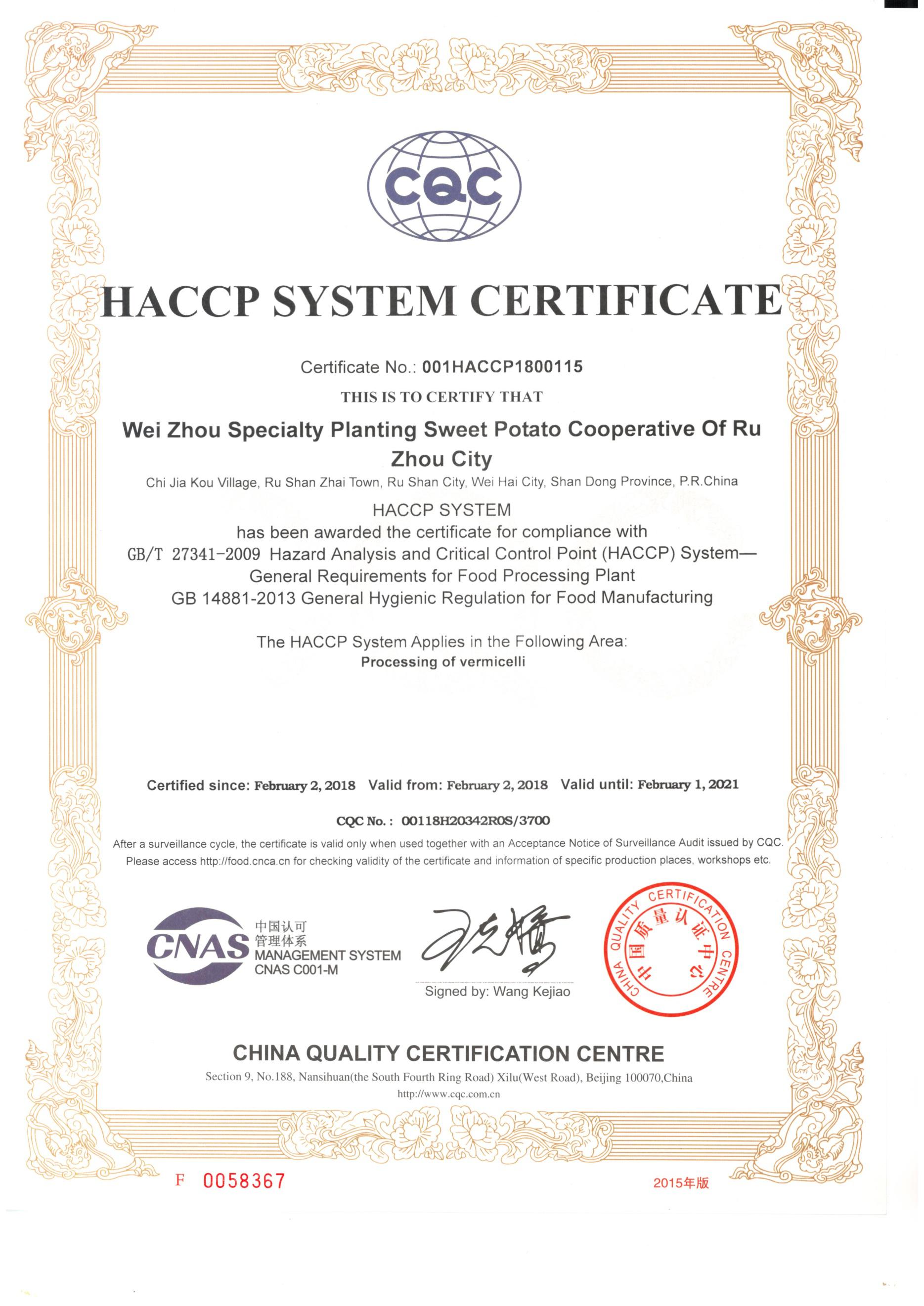 Shandong Shoujia Food Co., Ltd. has over 5,000 acres of sweet potato production base and 30,000 square meters of standard workshop. Its annual output is around 12,500 tons. Its main use is for our sweet potatoes that is used for deep processing for our vermicelli series. The registered trademark is "Chijiakou".