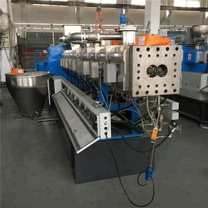 Advanced twin screw extruder characterized by high efficiency mix-ing combined with low energy con- sumption per kg output. The under water pelletizer cuts polymer strands into pellets immediately after they have passed the die plate.