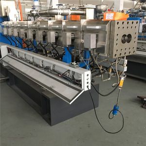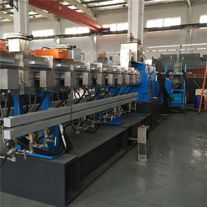 Advanced twin screw extruder characterized by high efficiency mix-ing combined with low energy con- sumption per kg output. The under water pelletizer cuts polymer strands into pellets immediately after they have passed the die plate.