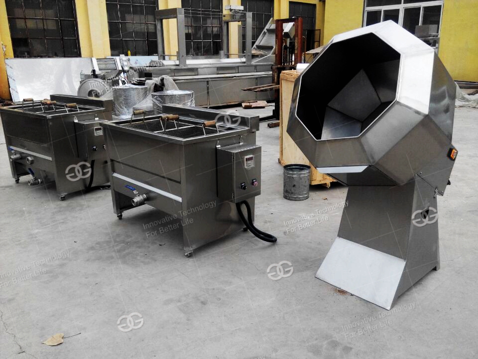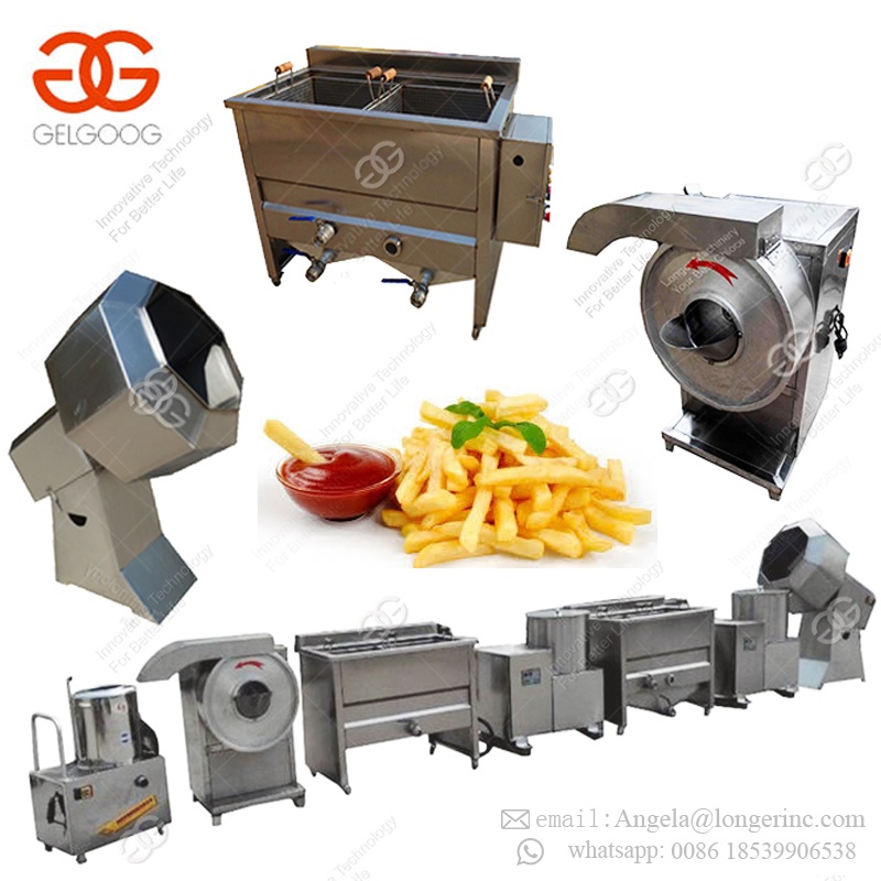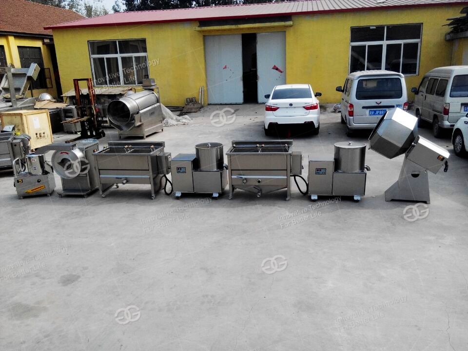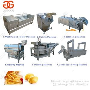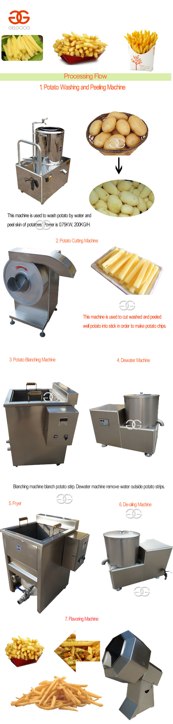 1.Potato Cleaning Peeling Machine 2.French Fries Cutter Machine 3.Vegetable Blanching Machine 4.Dewater Washing 5.French Fries Fryer Machine 6.Deoiling 7.Flavoring machine 8.Potato Chips Packing Machine