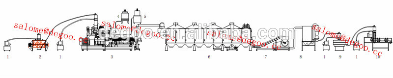 1 Raw material mixer 2 twin screw Extruder 3 air conveyor 4 three layers Oven 5 automatic crash system 6 Powder mixer