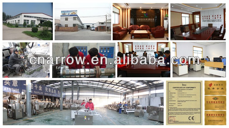 We are professional manufacturer of food extruder and mainly deal with the manufacture, research and development of the inflating food machine. According to the clients’ different requirements, we could offer the whole complete processing line for all kinds of expanded snacks, corn flakes, nutrition powder, and pet food and so on. Our technical assistance will help clients produce high quality products all the time. Depending on our rich experience and professional experts on the extruded food industry, we could offer the most suitable and complete program to assure that your investment will get biggest profit.