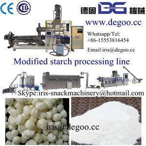Twin screw extruder for producing modified starch is kind of new technology for modified starch.The technology combined with conveying,blending,temperature up and pressure up,shearing and melting etc process on twin screw extruder to accomplish thermo-chemical denaturation process of starch.It is a thermo-chemical process which is high temperature,short time,low moisture,high energy .