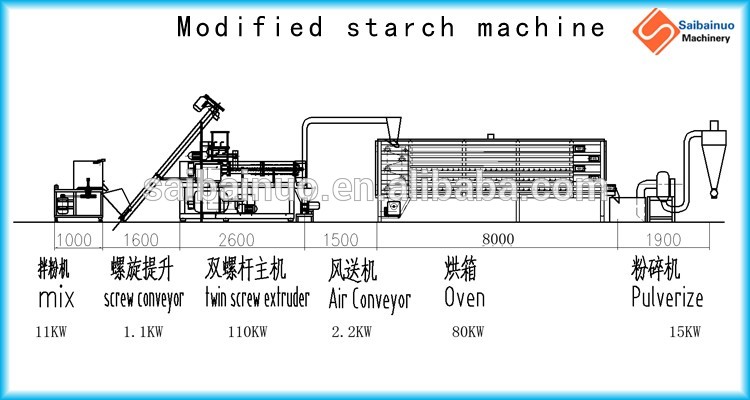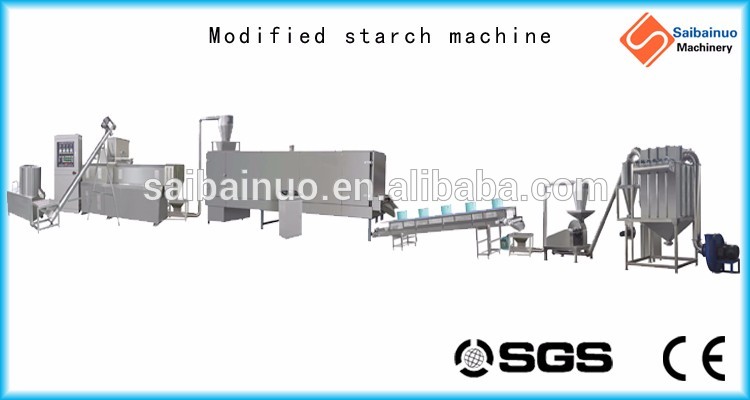 Modified starch, also called starch derivatives, are prepared by physically, enzymatically, or chemically treating native starch, thereby changing the properties of the starch. Our company machines can make modified starch with screws extrusion method. The finished product is also called pregelatinization starch, which can be used in food, pharmaceuticals, paper, building material, casting, oil drilling industry. This production line includes mixing, extruding, drying and conveying system. The extruder has one couple of high hardness alloy steel screws.